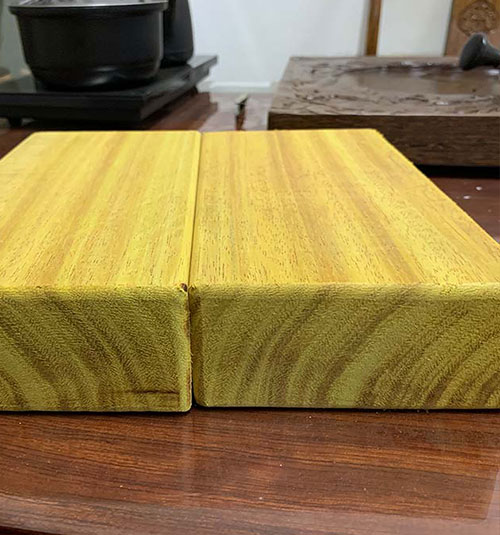 橫斷面:心邊材區(qū)別明顯,心材金黃褐色略帶綠色調(diào),久則轉(zhuǎn)為紅棕色,具深色細條紋,邊材淺粉紅色.